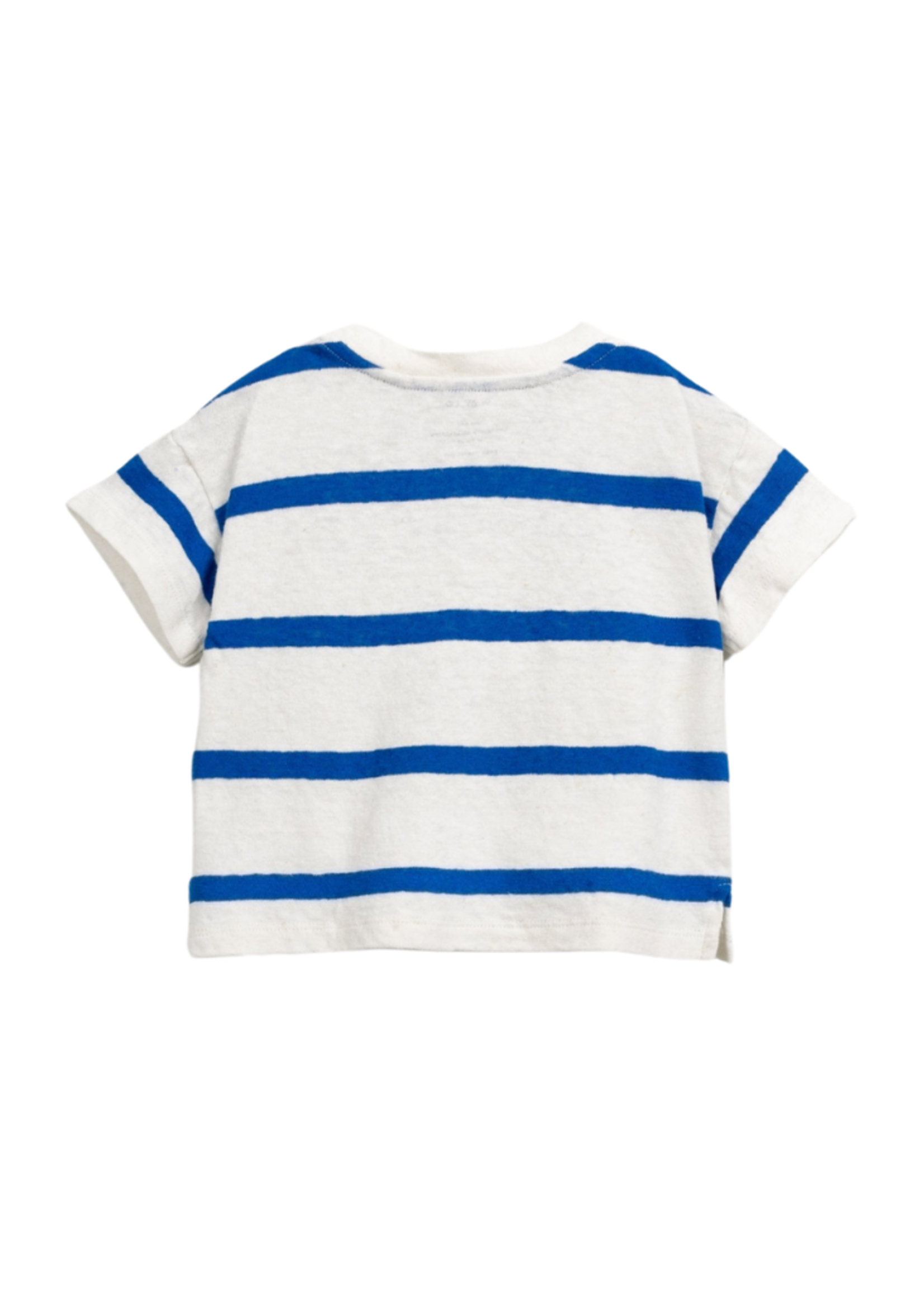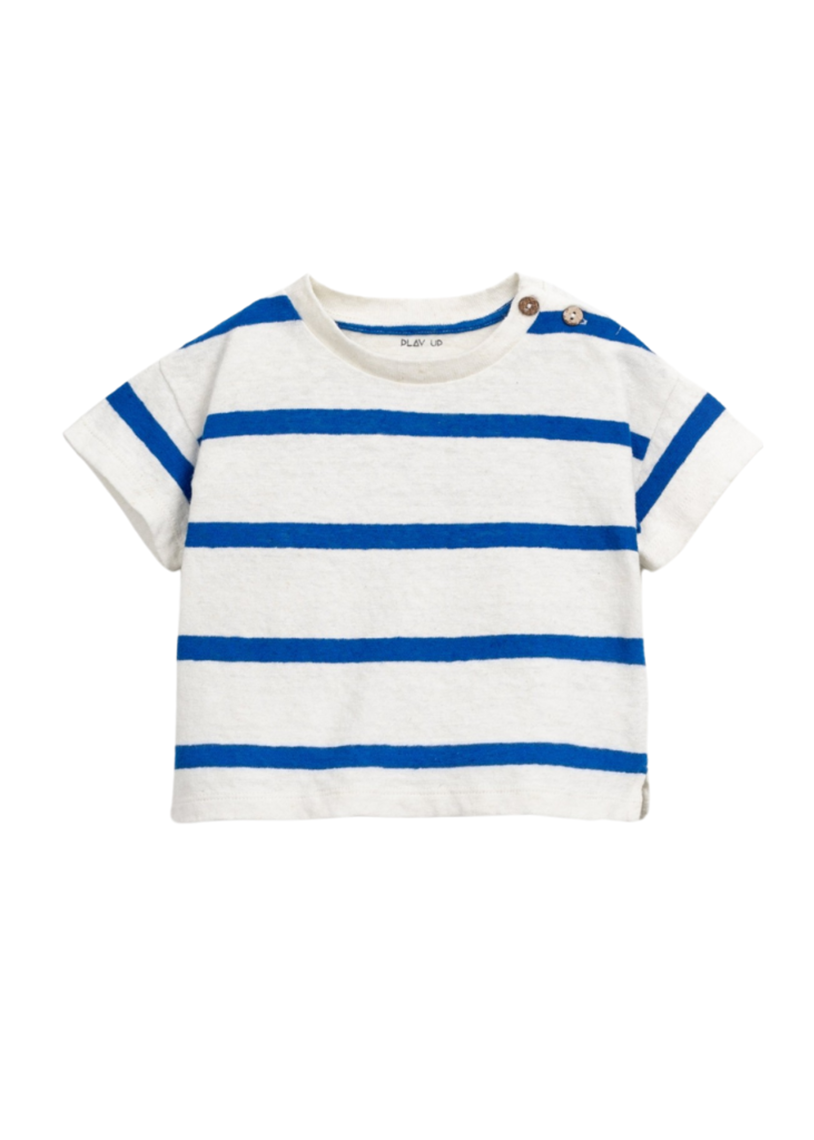 The Patrick Top is made of jersey fabric with a blend of organic cotton and linen, featuring a striped pattern. It has short sleeves, a round neckline, and a shoulder opening with coconut buttons.