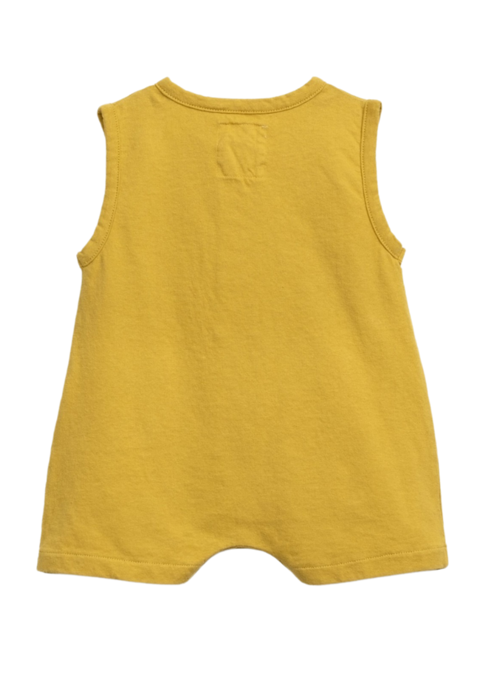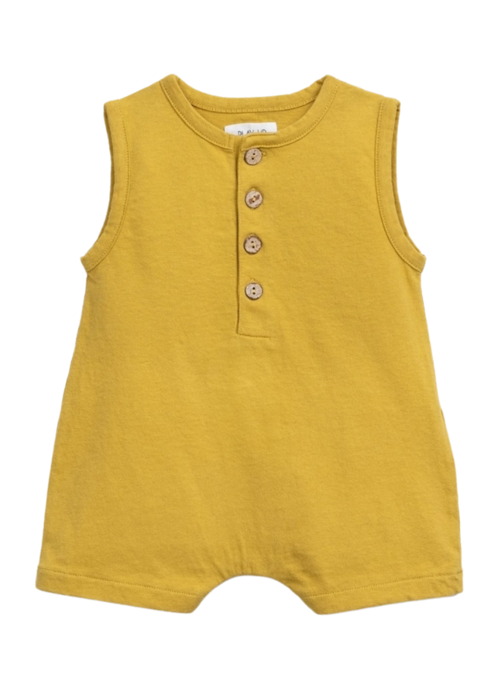 The Perry Romper is made of jersey with a mixture of organic cotton and recycled cotton, in Esteva color. It is a sleeveless model with a round neckline, featuring a front opening with coconut buttons and a leg opening with nickel-free metal snaps